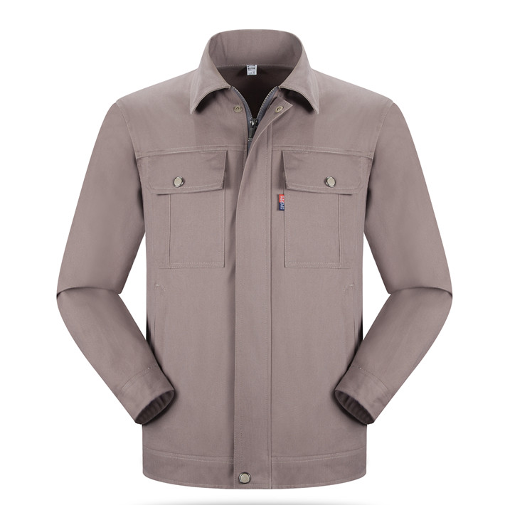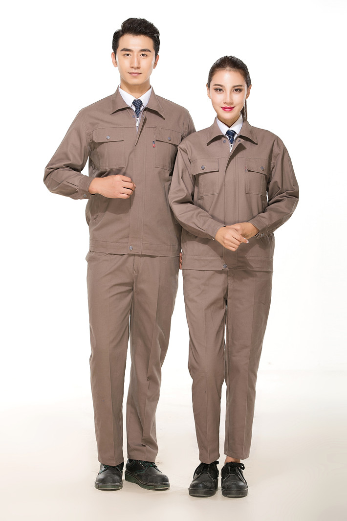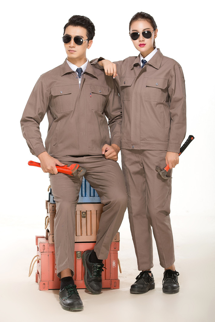 全棉紗卡卡其色拉鏈?zhǔn)焦ぷ鞣L袖套裝GZ-8022
